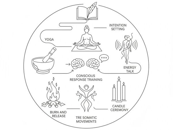 The release process continues with a ceremonial burn ritual, followed by a fascia-focused TRE® session to support the body in naturally releasing stored tension and stress. The day concludes with a deeply restorative sound bath for integration, rest, and renewal.